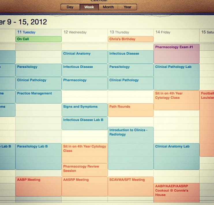 I'm intrigued by this Plum Paper things too. I've always felt like my schedule was too fluid for a pen-and-paper planner so in vet school I just used the calendar app on my Apple products...I liked that it automatically synched between my Macbook, iPhone, and (eventually) iPad so I always had the most recent version. I set it up with recurring events for the classes but could still easily drag them around when things got rescheduled. I used different colors to label classes (blue), extracurriculars (orange), work schedule (green), and exams (purple). It worked really well at the time.