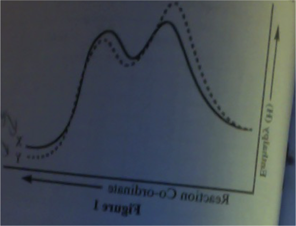 The attached graph is kinda bad quality...Y axis is enthalpy(H) and X axis is Reaction coordinate. Y is the dotted line and X is the solid line. Y ends at a lower enthalpy than X.