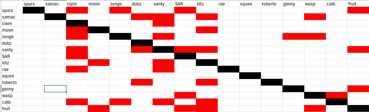 Unpairing list; this is kinda NAI bc I’ve seen scum beans do this, and also helps when you know you’re using a deep wolf strat to push for pair analysis that clears you/your pack. But it did help us get wasp.So, I was inspired by SAR's work in snack wars and started an unpairing spreadsheet at the beginning of the game. Here's how it looks right now (red = likely unpaired):