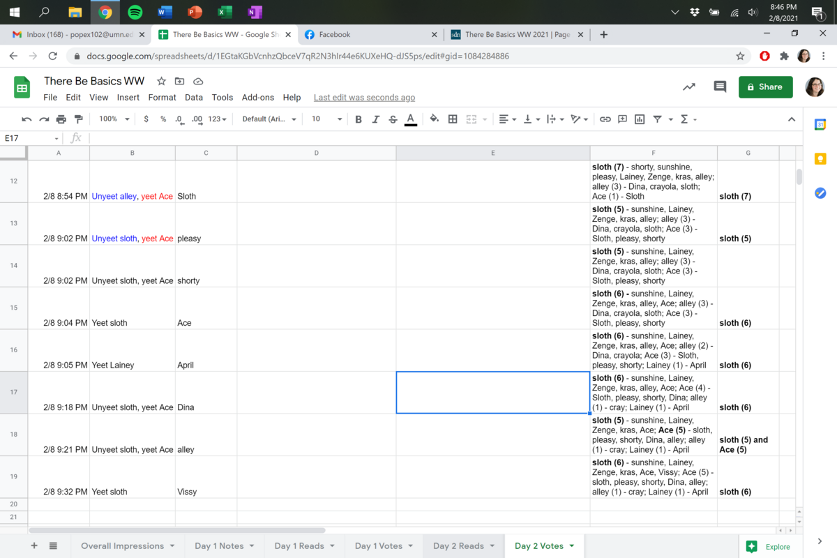 The preoccupation more with how your vote will be perceived than where you think it will be productive is interestingMy predicament is that I do not feel good enough to vote on either Sloth or Alley. Problem is if I vote Alley and she turns out to be a villager I look like a wolf. If I vote sloth and he turns out to be a wolf it makes it seem like I may have sold out to pressure and made the easy choice.