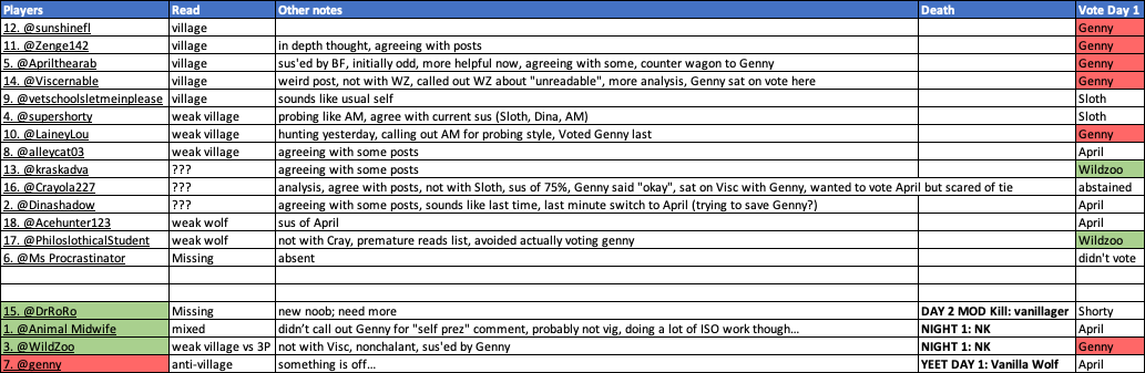 April- Genny voter, is wolf hunting, but I dont want to be too biased since I like her as a person and she tricked me as a wolf last game. I thought her tone was different from all of the previous games (so her wolfing game last time and the village games before it), but I think it has to do more with Ace playing and people susing her for being associated with him
