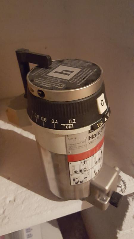 Turn the black knob at the back and lift it.That vaporizer has been empty for at least 15 years. This is one of our smaller community hospitals which got the hand-me-down anesthesia machines when the flagship hospital upgraded yeas ago. The Halothane vaporizer is there strictly for decoration. With a little handy work, I think it would make for a sick French Press - if only I could figure out how to get the damn thing off.