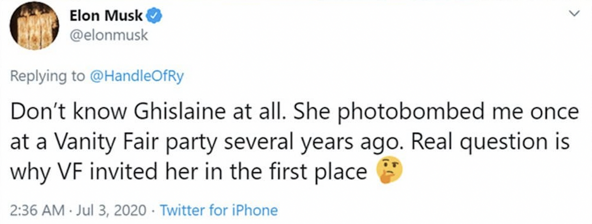 I don't particularly like Elon. Never really did, but he is intriguing. I don't get why people that liked him, now hate him just bc he said he won't be voting Dem any longer. Seems very flakey. Anyway to answer your question: Seems like he did know her and lied to distance himself from her/Epstein. It is a bit suspicious. FYI- I think it is healthy to have a dose of suspicion regarding any celebrity, politician, billionaire. Too many examples of the power ruining them as a decent human being.