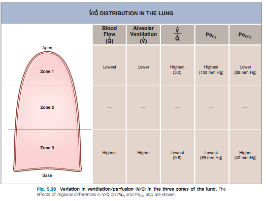 However, in areas of low ventilation, there is actually HIGHER PO2 in the alveoli. In areas of high ventilation, there is LOW PO2 in the alveoli. So how does this make any sense? Shouldn't this be opposite? We also learned this same thing in class, so I am a bit confused as to how this can be reconciled (in other words, how do you reconcile the high PO2 and low ventilation in Zone 1 with the fact that Zone 1 vasculature is vasoconstricted compared to Zone 3? Shouldn't it be vasodilating due to high O2?)