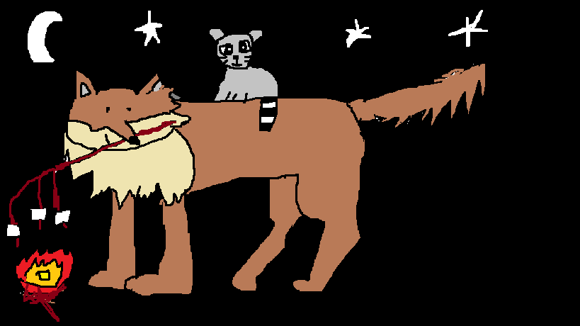 "Fox, racoon, husky BBQ; squirrels steal food, run to tree."