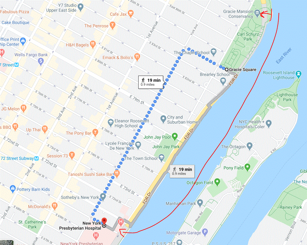 Zoom out and guess what's also walking distance away? At least one of the hospitals mentioned, NY Presbyterian (several hospitals are mentioned, ranging in distance from a few blocks to a few miles away) is also walking distance, less than one mile away from the Mayor and from where people are crowding together like sardines on park benches in the sun, banging in to each other playing sports while sweaty, bros throwing down yoga mats, and sneezing on past each other ranging in ages from babies to the elderly.