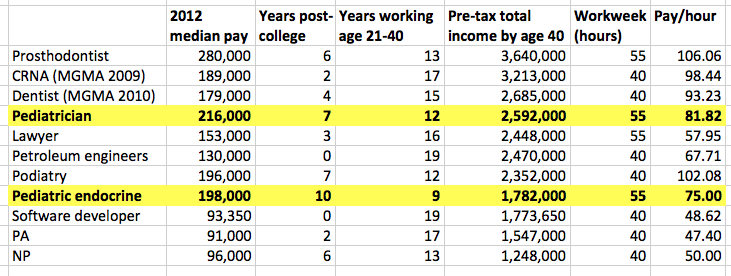 Now I know this is medicine and there is a large humanitarian aspect to it, and especially so when it deals with kids, but I feel like I can reach and help people in any field. It just seems unfair that you put in thousands more in $$loans, time, and take on responsibility for children's lives and for the work of your team, just to make as much as a CRNA, PA, etc. I even know people without college degrees (albeit not common) that make this much.