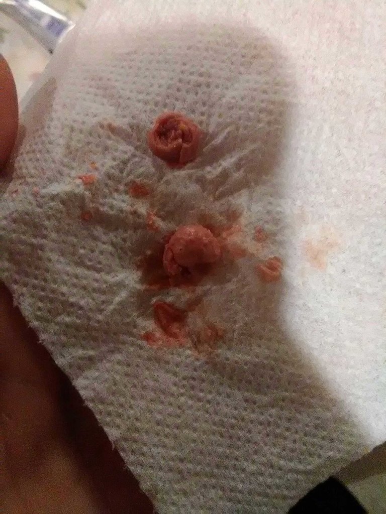 Hi hopefully I have came to a place where someone can help me. I have recently had a yeast infection and started my menstraul cycle the same day. I treated yeast infection with diflucan, and over the counter monistat suppositories. The day after my last suppository I went to the bathroom and something came out of my vagina, or urthera however I believe they were passed in my blood. They are hard and feel like rocks .. and now I'm in pain around vaginal opening. Doesn't appear to be uterine lining miscarriage or kidney stone etc. Please help
